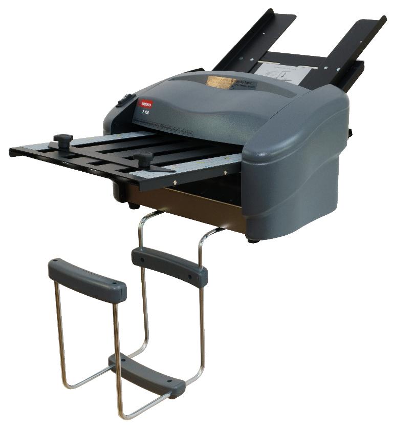 Bretter raskt dine brev, DMer o.l. En meget prisgunstig falsemaskin som tar liten plass. De ferdig brettede arkene legger seg fint i den store mottaksenheten. Passer for bedrifter med små til mellomstore print volum. Egen innmating for ark som er stiftet, maks 3 stk.