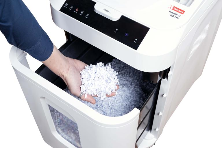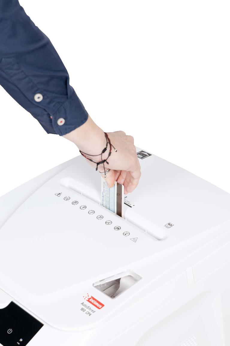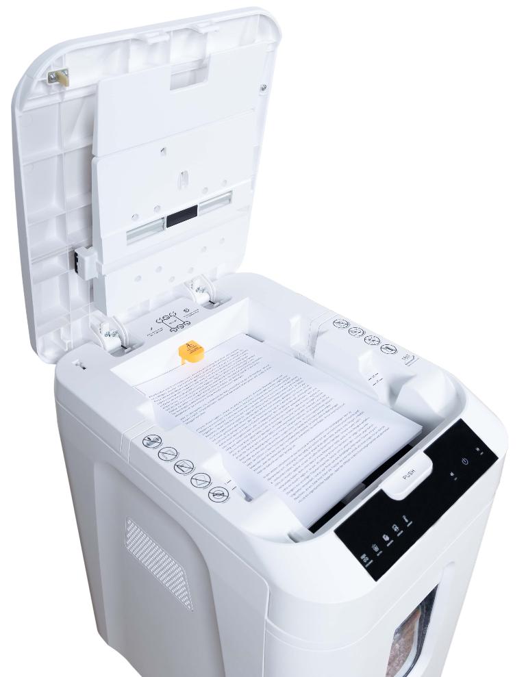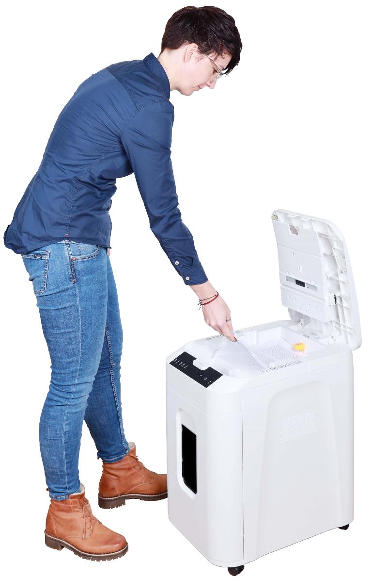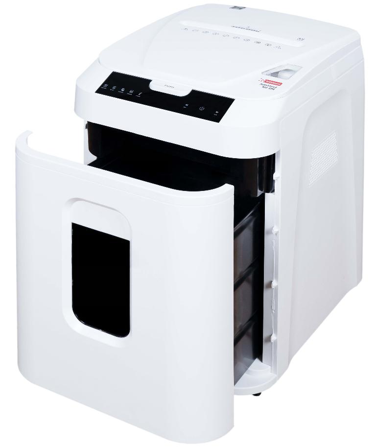 Liten makuleringsmaskin med automatisk matefunksjon. Legg inn arkbunke på opptil 180 ark, lukk lokket og fortsett å jobbe. Maskinen makulerer for deg og slår seg av når bunken er makulert. Maskinen tåler å bli kjørt i opptil 2 timer av gangen før den må ha pause/avkjøling.